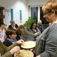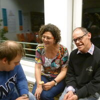 Luise Hämmerle im Gespräch mit Rene Kremser und Eberhard Zumtobel. Ein Häppchen Brot in der Hand. -