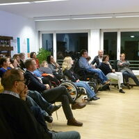 Von der Fensterreihe im Hintergrund bis zur Säule links im Vordergrund sitzen Frauen und Männer in Roll-, Büro- oder Sitzungsstühlen dicht nebeinander in einem leichten Bogen vor dem Referenten. Alle lauschen gespannt, mit interessierten Blicken. -
