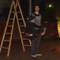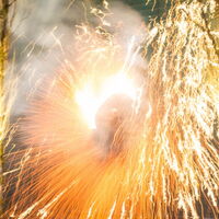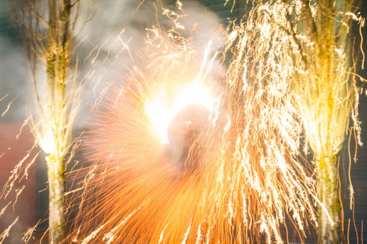 Pompo steht auf der Leiter und schwingt Feuerwerkskörper. Man sieht ihn kaum vor lauter Feuer. -