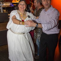 Kleopatra Ilse im weisen Gewand schwingt das Tanzbein mit einem Mann. -