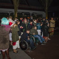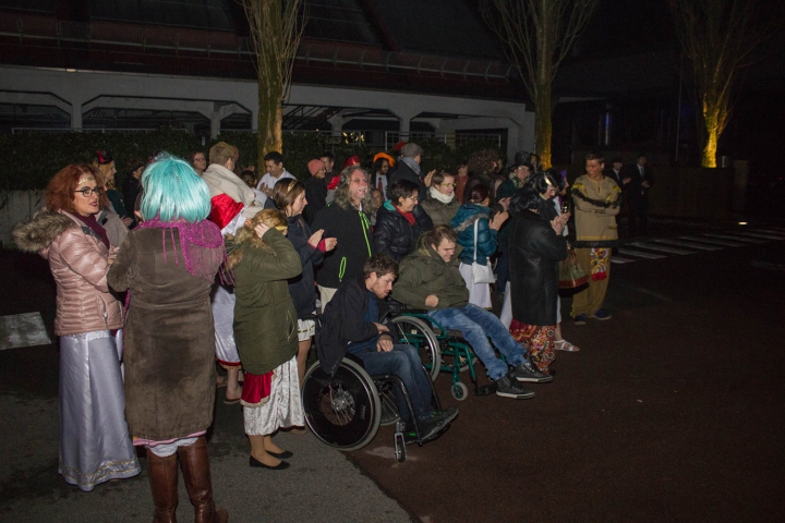 Frierende Krüppelballgäste schauen dem Feuerspecktakel zu. -