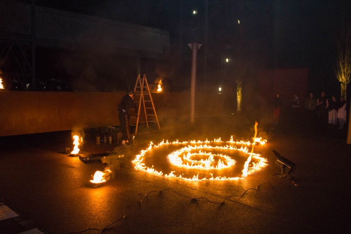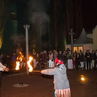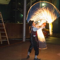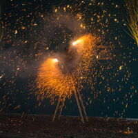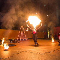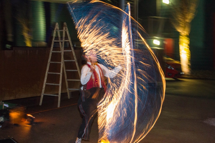 Kreise aus Feuer. Pompo schwingt seine brennenden Keulen. -