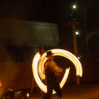 Feuerkünstler Pompo schwingt brennende Stäbe die einen brennenden Schweif erzeugen. -