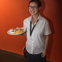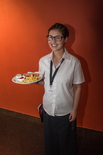 Eine Bedienung mit Wiener Würsten und Pommes in den Händen. Dank an das Team von MO Catering. -