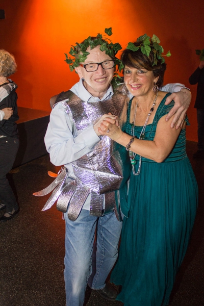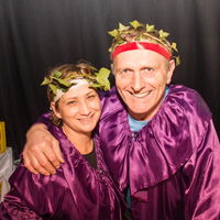 Ein Tanzpaar mit einem Efeukranz auf dem Kopf strahlen in die Kamera.