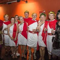 Heinz mit seiner Turnergruppe, die als Cesaren verkleidet sind, posieren vor der Kamera. -
