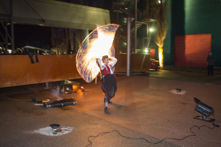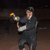 Feuerkünstler Pompo steht vor seinen brennende Stäbe mit einem unschuldigen Gesichtsausdruck. -