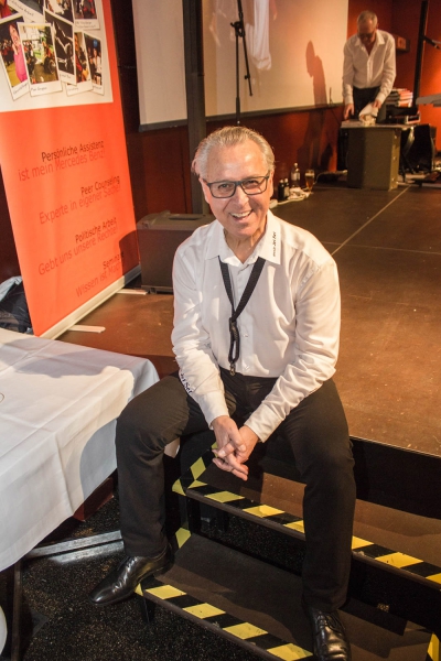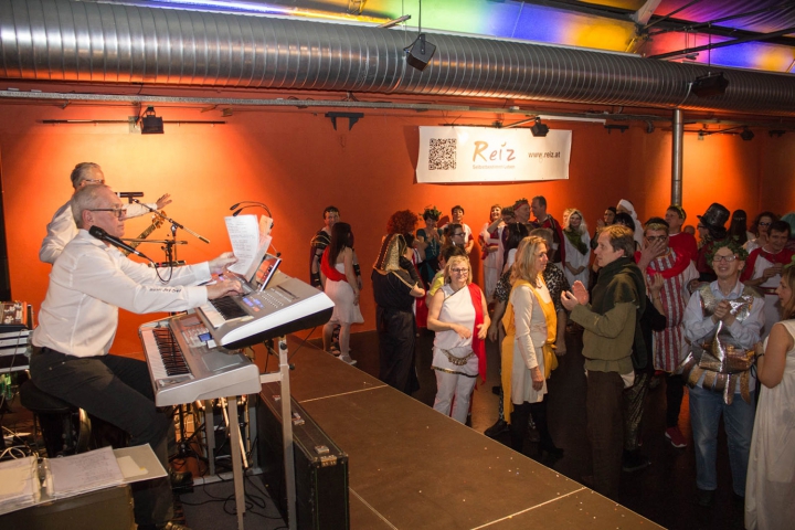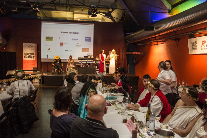 Obmann Andreas Guth als Pharao verkleidet eröffnet den 8. Krüppelball. Links die Moderatoren Reinhard Zischg und Sabrina Nitz. Auf der rechten Seite übersetzen die Gebärdendolmetscherinnen die Worte des Pharaos -