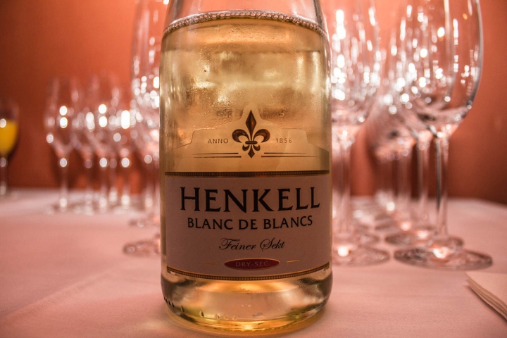 Im Vordergrund eine Sektflasche. Im Hintergrund verschwommene Sektgläser. Danke an unseren Sponsor Henkell der uns jedes Jahr den Sekt für den Sektempfang zur Verfügung stellt. -
