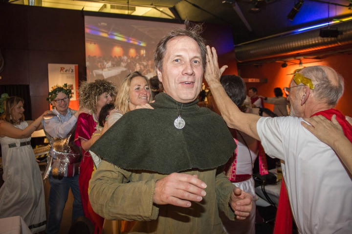 Cesar Hans-Peter legt seine Hand auf die Schulter von Dietmar, der einen Ritterhut auf dem Kopf trägt. -