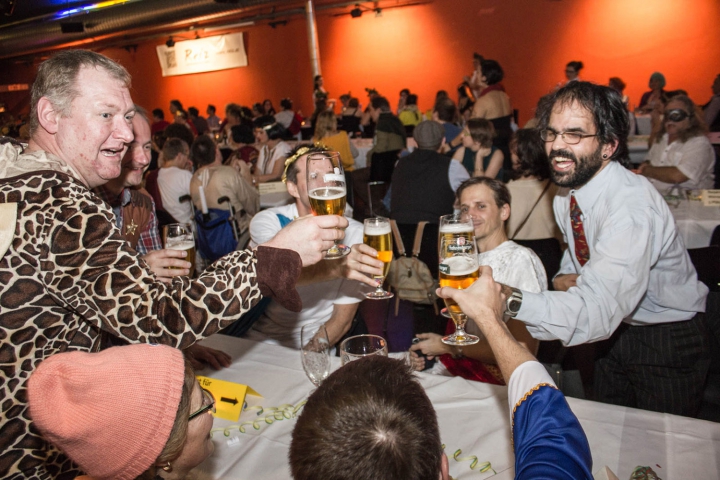 Die Krüppelballgäste lauthals singend beim Polonäse tanzen. -