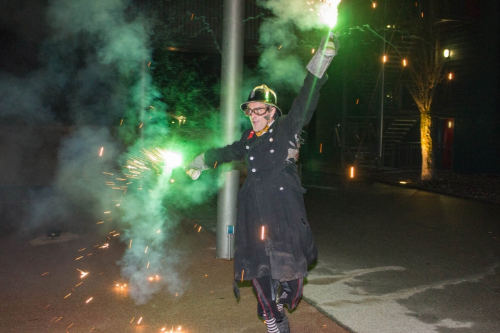 Pompo als Feuerwehrmann verkleidet hält zwei Feuerwerkskörper zu Boden und macht ein schelmisches Gesicht. -