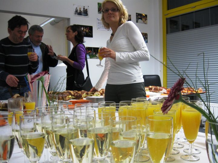 Mit Sekt und Orange gefüllte Kelche und zwei fliederfarbene Blumen im Vordergrund. Eine lächelnde junge Frau steht hinter dem Buffet und ladet ein zum Trinken und Essen.