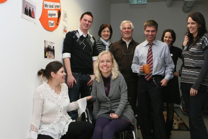 Lächelnde hübsche Rollstuhlfahrerin Sabrina N. und die hübsche Heidi M. sind mit all den geladenen Gäste bereit die Eröffnungsrede zu starten.