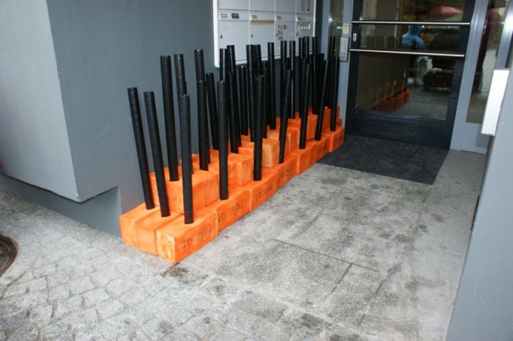 Die orangefarbenen Hämmer mit schwarzen Stielen stehen in Reih und Glied, der Einsatz ist vorbei.