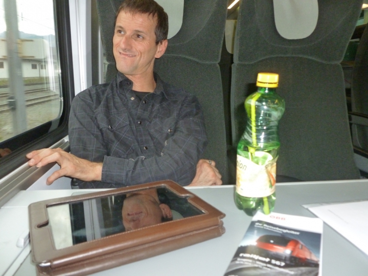 Ein Mann sitzt im Zug, er schaut aus dem Fenster raus. Vor ihm ist ein Tisch. Darauf steht eine Trinkflasche. Ein I - Pad und ein Prospekt liegen daneben.