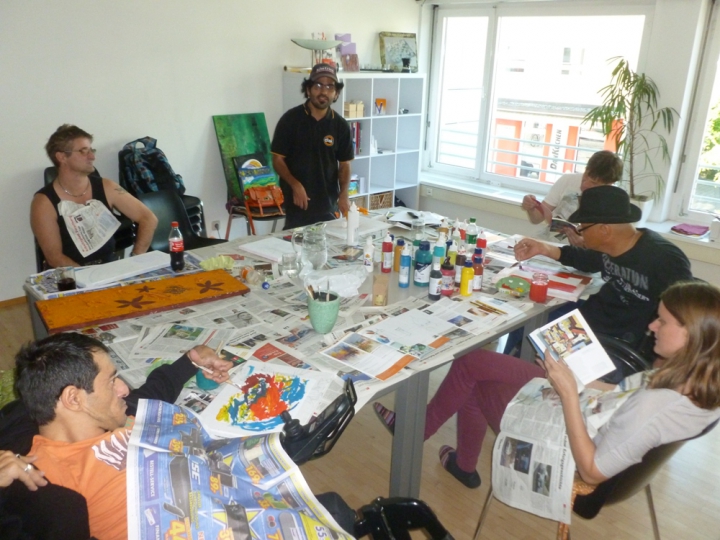 Sechs Menschen sitzen mit bunten Farben malend an einem großen Tisch.