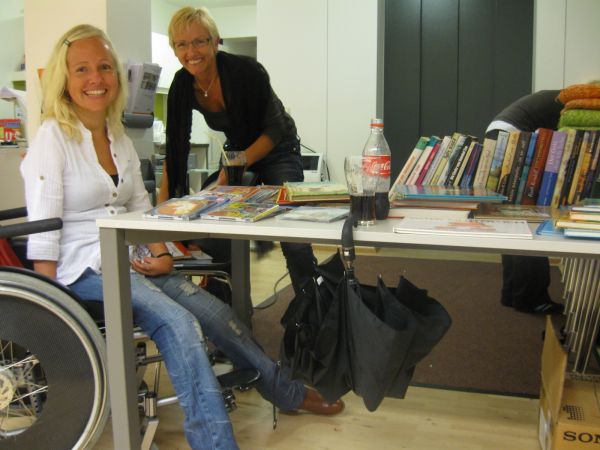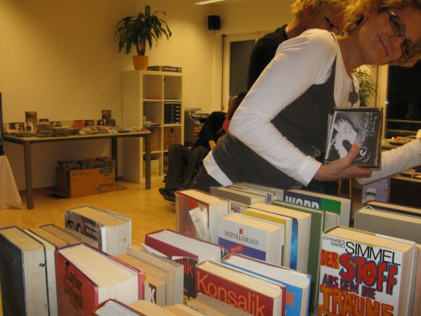 Ganz im Vordergrund: Bücher stehen bereit zum Schmökern. Zwei Frauen mit Brille beugen sich über die Bücherbände. Eine Frau lächelt verschmitzt in die Kamera, ein paar CDs in der rechten Hand. Im Hintergrund ein Tisch gefüllt mit CDs.