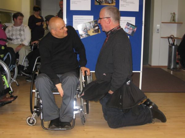 Ein Rollstuhlfahrer sitzt dem Betrachter zugewandt. Er schaut zu seinem Gesprächspartner, der rechts von ihm am Boden kniet. Dadurch sind beide Köpfe auf der gleichen Höhe. Hinter den Beiden steht eine blaue Pinwand mit Bildern und Texten. Im Hintergrund