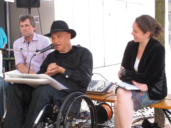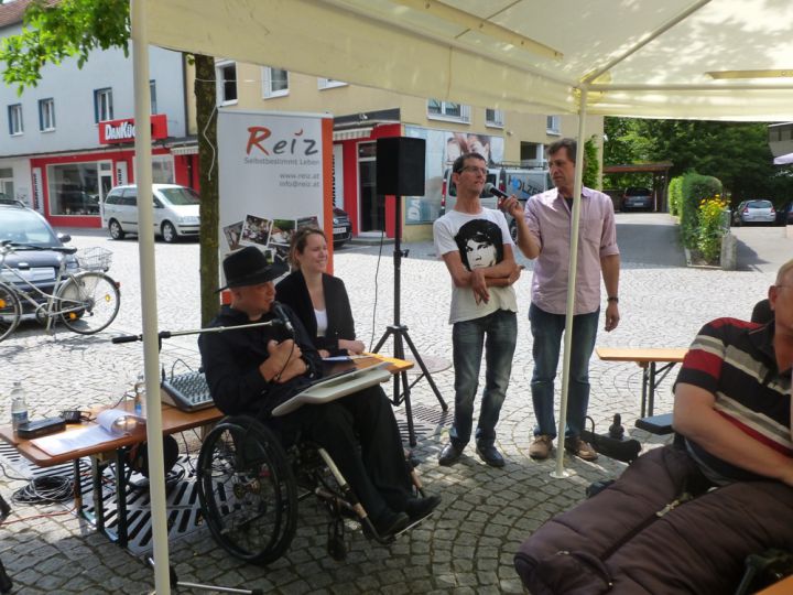 Marianne Schulze verfolgt lachend und mit verschränkten Händen die Ausführungen von Reinhard Zischg. Reinhard ganz in Schwarz, lässig im Rollstuhl nach hinten gekippt. Heinz Grabher im Hintergrund mit verschlossenen Lippfen.