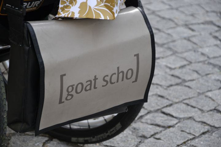 Eine Tasche bei einem Rollstuhl macht Mut. Auf der Tasche prangt die Aufschrift: goat scho.