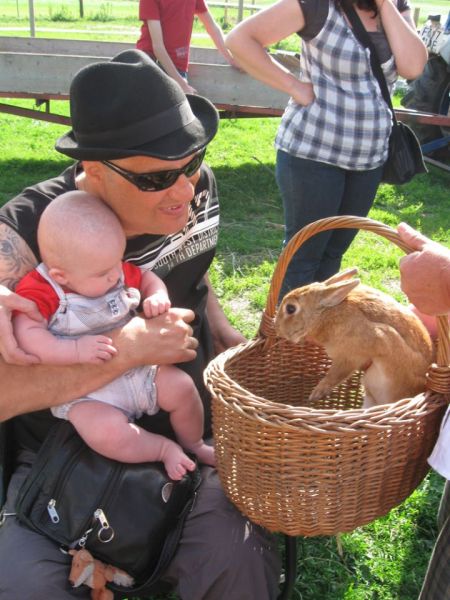 Reinhard hält seinen Sohn Noah auf dem Schoß und begutachtet mit ihm einen Hasen, der aus einem Korb gehoben wird.