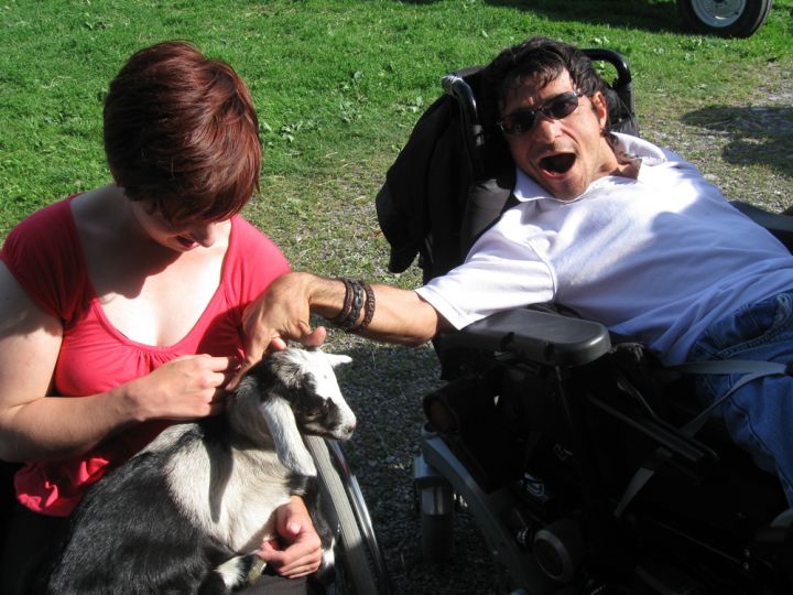 Das Ziegenbaby bekommt Streicheleinheiten von Julia und Sülo.