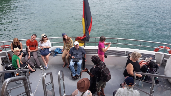Die ReizlerInnen habe sich am Schiffsheck eingerichtet. Sabrina und Elisabeth mit sommerlichen Stohhüten am Kopf. Schildkappen tragen Katrin, Markus und Marco. Sülo, Gül, Dana Andi und Alex lassen ihre Haare an der Sonne. Die Deutschlandfahne flattert.