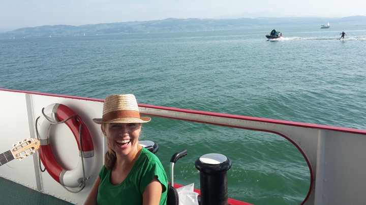 Sabrina sitzt an der Reling und verschickt ein fröhliches Lachen. Im Hintergrund brettert ein Motorboot mit einem Wasserskiläufer durchs Wasser. Segelboote blinken mit weißen Segeln.